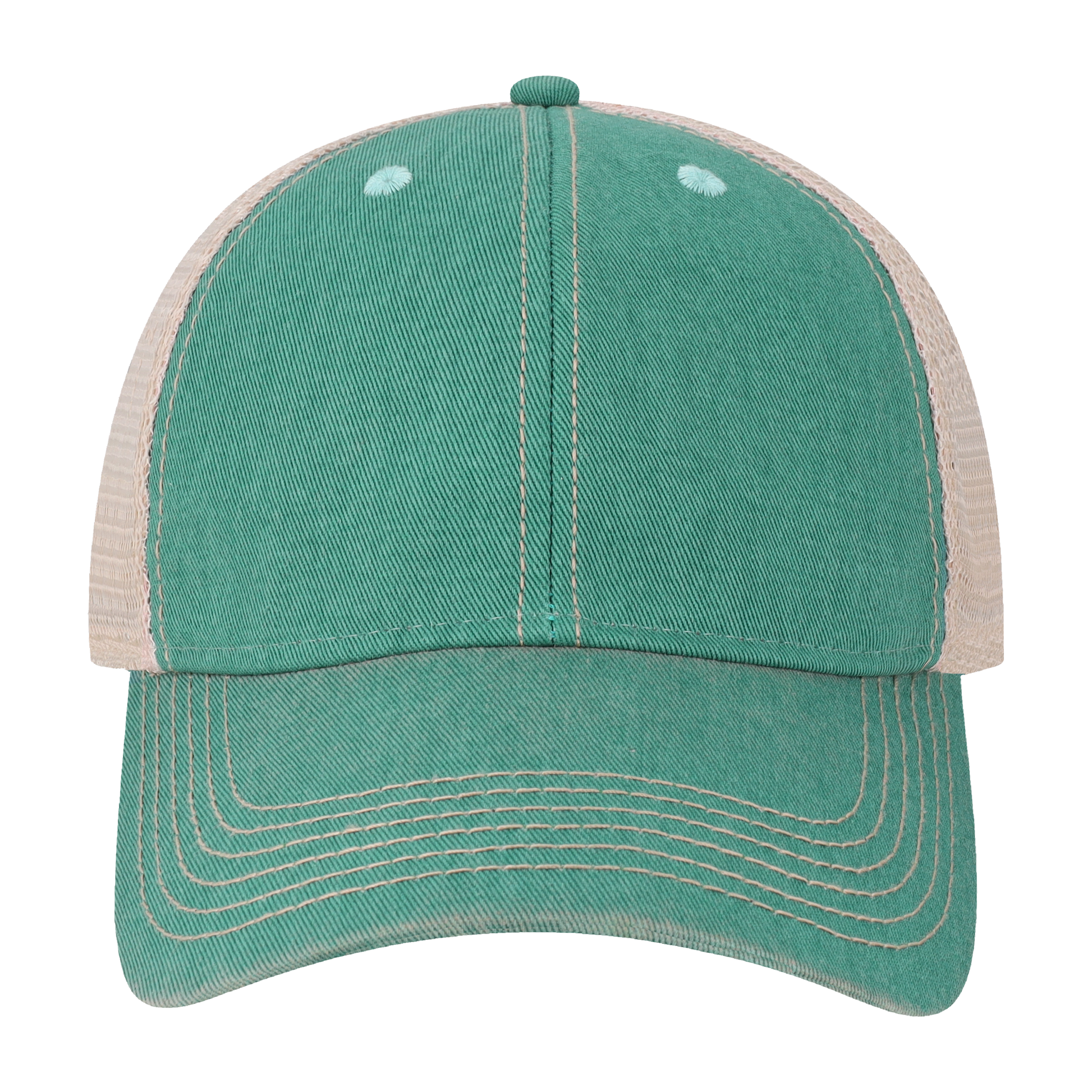 - Details: Full crown top-stitch, coated “dirty” wash, kelly-green under-visor